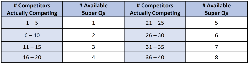 In Snooker, there is 1 “Super Q” available for every 5 dogs actually competing in a height class provided the score is 37 points or more, as exemplified below: